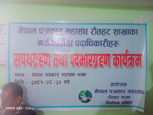 नेपाल पत्रकार महासंघ रौतहटको नवनिर्वाचित पदाधिकारीहरुको शपथग्रहण कार्यक्रम सम्पन्न भएको छ। महासंघ रौतहट शाखामा नवनिर्वाचित अध्यक्ष संजय कुमार कार्कीले आइतबार सपथग्रहण संगै कार्यभार सम्हालेका छन् ।