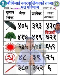अहिलेसम्म ३ वटा वडाको परिणाम मध्ये बौधिमाई १ मा जसपाका रामजोधी राउत कुर्मी,वडा नम्बर २ मा नेपाली काँग्रेसका धर्मेन्द्र प्रसाद पटेल,वडा नम्बर ९ मा नेकपा एमालेका मुक्तिनारायण मिश्र विजयी भईसकेका छन् । वडा नम्बर ८ सरमुजवाको मतगणना जारी रहेको छ ।