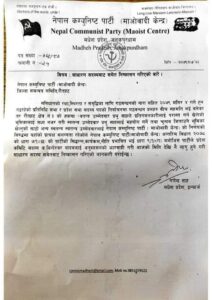 सोको सट्टा पार्टीको निर्णय बिपरित अन्य स्वतन्त्र उमेदवारको प्रचार प्रसारमा संलग्नता देखिएकाले माओवादी पार्टीको आन्तरिक बिधान २०७८ धारा ७ , १६ को पार्टीको सिधाान्त ,कार्यक्रम, नीति प्रभावित भै धारा ९ एक ग बमोजिम प्रदेश कमिटी सदस्य बिन्देश्वर यादव र रबिन्द्र पटेल धिरज लाई हिजो २२ गते देखि नै लागु हुने गरि पार्टीको साधारण सदस्य समेत बाट निस्कासन गरिएको मधेस प्रदेश माओवादी ईन्चार्ज गणेश साह द्वारा हस्ताक्षरित बिज्ञप्तिमा उल्लेख रहेको छ ।