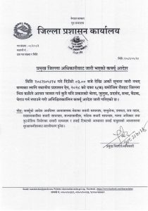 स्थानीय प्रशासन ऐन, २०२८ को दफा ६(क) बमोजिम जारी गरिएको आदेशअनुसार अर्को सूचना जारी नभएसम्म जिल्लाभित्र सर्वसाधारणले कुनै किसिमको आवतजावत, भेला, जुलुस, प्रदर्शन, सभा, बैठक, घेराउ लगायतका क्रियाकलाप गर्न नपाउनेछ ।