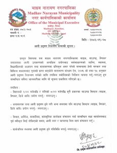 विवाह, धार्मिक, सामाजिक तथा सांस्कृतिक कार्यक्रम सञ्चालन गर्दा सम्बन्धित वडा कार्यालयबाट पूर्व स्वीकृति अनिवार्य लिनुपर्ने।